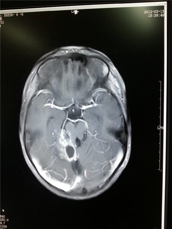 一年后文文回院进行头颅磁共振检查提示:原肿瘤明显缩小。“文文恶心,呕吐,走路不稳的症状都有改善。”2013年文文定期回院再次磁共振检查,发现原有的肿瘤已完全消失,基本无自觉症状,并能正常上学了。