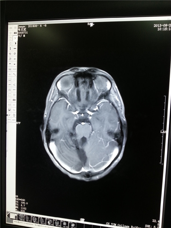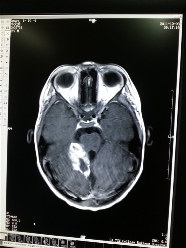 2011年4月初,家住南宁市的5岁男孩文文因反复头痛、呕吐而到南宁某区级医院就诊,经磁共振检查考虑为脑肿瘤。4月12日行开颅肿瘤切除术。手术后病理报告为:胶质细胞瘤2级。术后稍好转出院。但术后文文出现行走不稳,易摔跤的情况。
