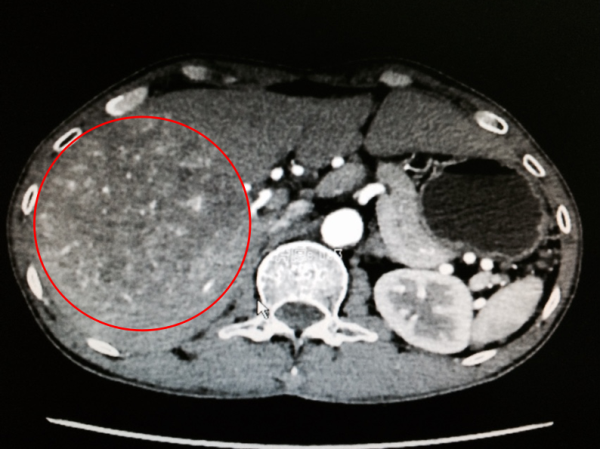 住进医院后,肝胆腺体外科张洪昌主治医师马上为梁先生完善了各项相关检查,检查结果显示,梁先生肝多发囊肿、肝右叶“住”着一个巨大肝肿瘤,直径大约160mm!