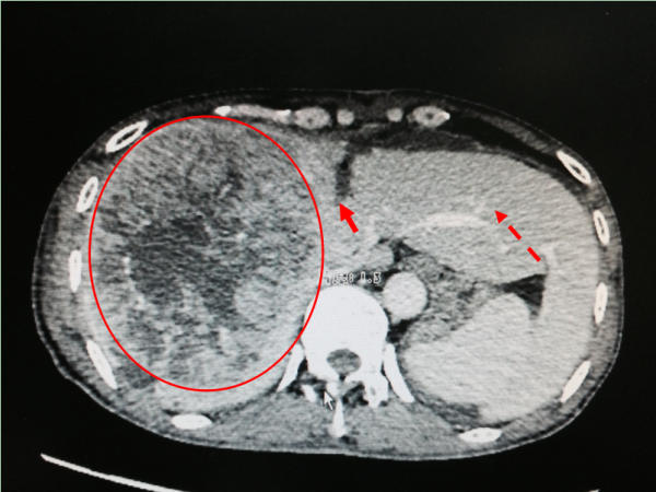ALPPS第一步(门静脉结扎及左右半肝的离断)手术后CT图:红圈为肝肿瘤;实心箭头为左右半肝离断处;虚线箭头为增生左肝叶。