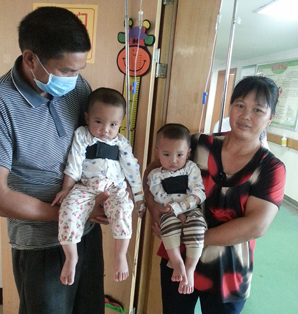 家住桂平市大湾镇下山村的王富平、王富安双胞胎两兄弟,出生40天兄弟俩同患肺炎,并住进当地医院。入院后经检查发现两个孩子均患重度小儿先天性心脏病(室间隔、房间隔缺损,动脉导管未闭)。孩子六个月时,其父母经人介绍来到了瑞康医院心胸外科就诊,经检查明确了重度先心病的诊断。其中弟弟当时已经出现了合并症——肺动脉高压。因小孩年龄太小,医生建议孩子长到11个月时来医院动手术。双胞胎因先心病原因抵抗力下降一年内患肺炎8次住院治疗。前后花费了5万多元。家里仅有的储蓄因孩子生病已花得精光。夫妻俩一时筹不到钱耽搁孩子最佳手术期。