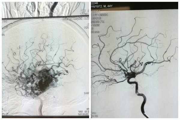 经过进行疑难、危重病例讨论及会诊后,我院神经外科主任范学政博士分析,黄先生左脑部有一处大于6cm的巨大动脉畸形,有深部引流,按照分级标准评价为4级(最高级为5级),且有多根动脉供血,合并静脉球瘤,病情复杂,治疗风险很高,单纯手术切除、介入栓塞治疗、放疗都难以一次性解决问题,单纯手术风险极大,重要神经功能保护相对比较困难,术后损伤发生可能性大,巨大动静脉畸形一次无法全部栓塞,需要多次治疗。他综合患者的情况,建议分两步走,先行动静脉畸形部分栓塞治疗,视治疗效果,再行手术切除。