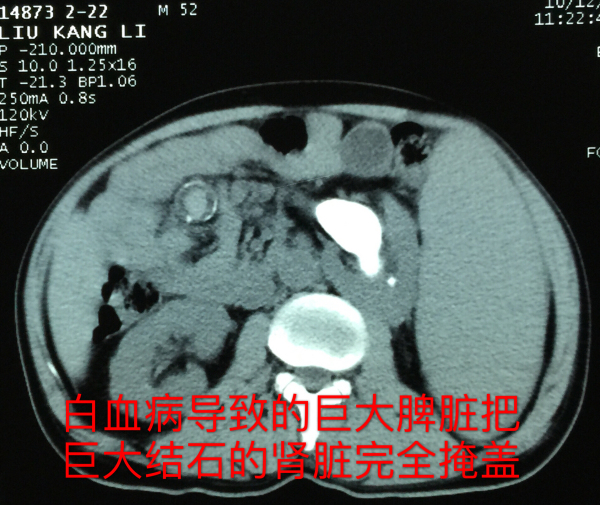 老刘白细胞149.59×10^9/L,右侧中上腹部有畸胎瘤占位,左肾结石非常巨大且复杂,而左肾又被白血病形成的巨大脾脏紧密包绕,还不包括胸膜和里三层外三层的肠道,从老刘的左肾取出结石无异于伸手从火红的熔铁炉内取出石头!要在老刘的身上做手术,将有80%的危险性,若不积极治疗,病人将面临100%的危险!
