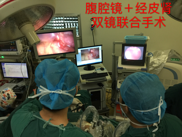 先密切监测血象、中西医结合降白细胞,输血改善贫血状况……等老刘的身体稳定后,经患者家属同意,11月16日梁泰生主任采取了目前国内外没见报道过的方法为老刘进行手术,即在全麻下行腹腔镜联合左侧经皮肾镜碎石取石术,经过3个多小时的努力,手术获得成功,术后老刘安返病房。