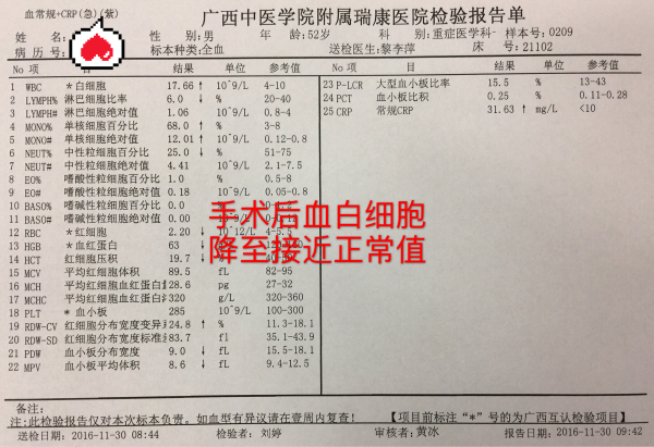 在老刘住院期间,泌尿外科的医生和护士众志成城,细心监护,一共请血液科、肿瘤科等科室专家进行了16次会诊,为他进行15次输血,2次抢救……虽然过程艰辛且曲折,但最终,泌尿外科的医护人员和老刘一起战胜了病魔,获得了成功,术后的老刘精神状态变得很好,白细胞值接近正常值,术后复查X光片显示结石被清理得很干净!12月10日,老刘顺利康复出院。出院当天,老刘一家还执意要和梁泰生主任合影留念以表感谢。