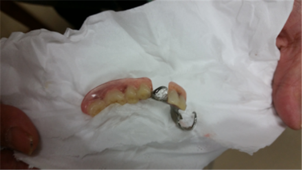 近日,我院急诊科收治了因假牙脱落卡住咽部的94岁老人闫大爷。闫大爷因为长期卧床,生活不能自理,言语表达不清,没法跟家人沟通,在发现他出现咽痛呻吟,口腔分泌物较多时,谁也不会想到是他的假牙被吞进了咽部,因此未予以重视。第二天晨起家属清理口腔时才发现假牙脱落,于舌根口咽部可见部分假牙,取出困难,即呼叫120急诊送我院,耳鼻咽喉头颈外科医生在急诊科的协助下,将下咽的假牙取出,幸运的是,虽然假牙滞留在咽部时间较长,但对老人的咽喉部位损伤不大。取出后予以收住耳鼻咽喉头颈外科住院进一步观察治疗,经消炎补液及对症治疗后,目前,闫大爷已康复出院。