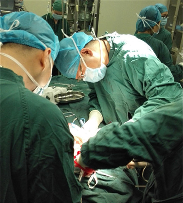 经病友介绍,说广西中医药大学附属瑞康医院是中西医结合医院,对她这病应该有独特的治疗方法,让她前往试试,于是在2016年11月21日刘女士来到瑞康医院耳鼻咽喉头颈外科就诊,经科室专家详细检查,发现患者面部肿瘤异常巨大,病因比较复杂,而且由于肿瘤生长时间长,肿瘤的消耗和营养的丢失让患者身体非常虚弱,手术风险较大。 根据患者病情,医院医务部主持耳鼻咽喉头颈外科、麻醉科、输血科、重症医学科、CT室等多学科会诊,各学科专家结合患者情况,从不同学科角度提出了详细治疗方案,经讨论后达成一致意见,并制订出严密的手术方案:先行基础治疗和营养支持调理,择机再行全麻下行颌面颈部肿物探查术+颌骨肿瘤切除术。可是,就在按计划进行基础治疗和营养支持治疗时,11月26日,患者面部肿物突然出现破溃出血!量约400ml!于是赶紧组织进行暂时性气管切开术+口腔肿瘤压迫止血术,术后送ICU治疗,病情稳定后转入耳鼻咽喉头颈外科继续治疗等待肿物切除手术时机。经多方论证,手术选在12月23日进行,由刘继远主任率领手术团队,行全麻下行颌面颈部肿物探查术+颌骨肿瘤切除术+带蒂胸大肌瓣修复术,手术历时6个多小时,成功地将患者面部直径超过15cm的肿瘤完整切除术和面部巨大的洞穿缺损修复术。