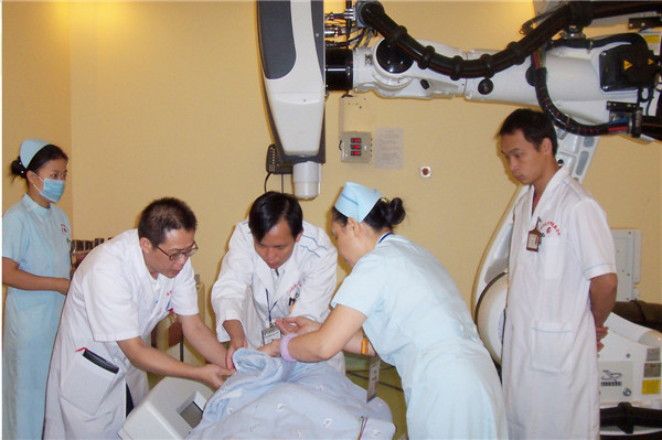 瑞康医院放疗一区与放疗二区合并为一个放疗科啦!现在的放疗科分为肿瘤放射治疗中心,射波刀治疗中心,放疗科病房三个部分,共开放床位69张,科室设备齐全,技术力量雄厚,仪器设备先进。拥有美国先进的调强放疗设备,瓦里安23EX电子直线加速器,荷兰核通公司Simulix—HQ模拟定位机, 美国Accuray公司MultiPlan计划系统,HIFU-2001型高强度聚集超声肿瘤治疗系统,以及当今国际最尖端全球最新型的全身立体定向放射治疗设备——射波刀。华南、西南地区只此一台,现已开展射波刀的肿瘤精确放疗5300余例,积累了丰富的临床经验。如今,除了国内病人,也常有国际友人慕名前来接受射波刀治疗。目前,瑞矿医院放疗科已广泛开展鼻咽癌、肺癌、肝癌、乳腺癌、食道癌、大肠癌、妇科肿瘤、恶性淋巴肿瘤等各系统恶性肿瘤的常规普通放疗、三维适形放疗、调强适形放疗、X-刀治疗、射波刀治疗,以及血管畸形、三叉神经痛等良性病的放射治疗。