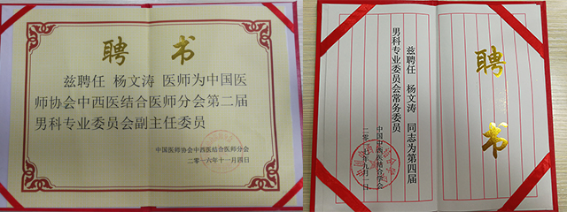 杨文涛主任先后被聘为中国医师协会中西医结合医师分会第二届男科专业委员会副主任委员、中国中西医结合学会第四届男科专业委员会常务委员、广西中西医结合学会男科分会主任委员等。充分体现了我院男性科在区内乃至国内的学术地位,铸造并形成了瑞康中西医结合男科品牌。