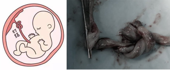 脐带打结为脐带异常情况中的一种。脐带打结有脐带假结及脐带真结两种。脐带假结是指因脐血管较脐带长,血管卷曲似结,或因脐静脉较脐动脉长形成迂曲似结,临床上一般无大危害,很少因血管破裂而出血。脐带真结较为少见,为脐带在宫腔内形成环套,胎儿活动穿越环套所致,发生率为0.5%~3%,多数在分娩后确诊。脐带真结可能影响胎儿血循环而致胎儿胎死宫内。