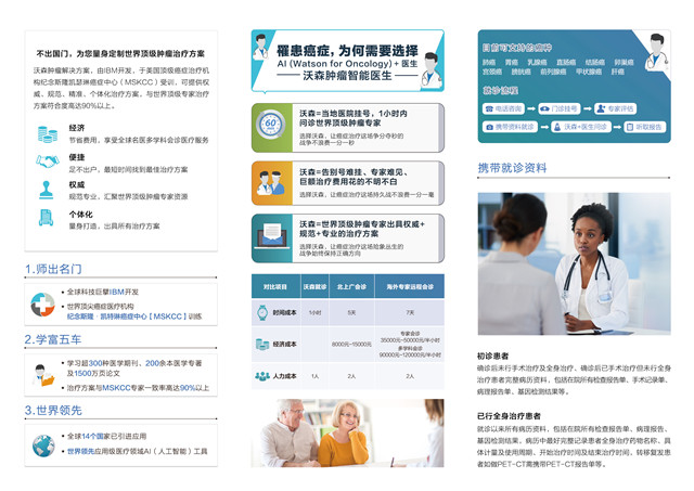 沃森肿瘤解决方案,由IBM开发,于美国顶级癌症治疗机构纪念斯隆凯瑟琳癌症中心(MSKCC)受训,它的人工智能分析,可以与全球的治疗方案进展同步实时更新,这就相当于同时接受全球顶尖的肿瘤专家们在线会诊,可以高效率的为病人提供权威、精准、规范、个性化的治疗方案,与世界顶级专家治疗方案符合度高达90%以上,有效避免不当医疗和过度医疗,从而提高肿瘤总体治疗效果。