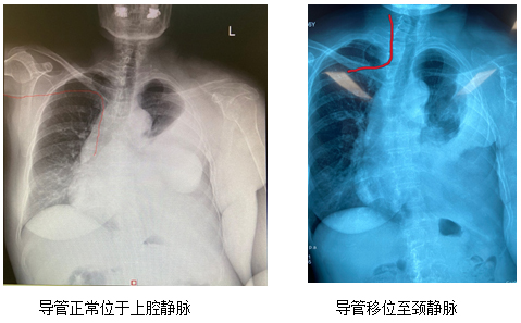 患者韦女士,56岁,今年6月因乳腺癌术后伴胸腔积液入住我院乳腺病科治疗。患者曾于2019年12月行右上肢贵要静脉置入中心静脉导管(PICC)并长期留置行间断输液治疗,6月25日发现导管异常回血伴头部活动时影响输液速度,经CT、X线检查明确导管移位至颈部静脉。
