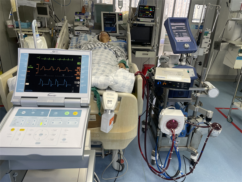 7月19日,55岁的蓝叔因“反复肛门肿物脱出伴便血”在外院住院治疗,次日凌晨2点他突然出现胸闷、气促、咳嗽剧烈、头晕、乏力的症状。医生为他查了心电图,提示ST改变(心电图ST段改变是诊断心肌梗死、心绞痛、心肌缺血的重要指标),经心血管内科医师急会诊后,考虑这是急性非ST段抬高型心肌梗死 Killip II级。但蓝叔有下消化道出血、重度贫血病史,存在冠脉介入治疗禁忌症,只能先予以药物保守治疗。然而,蓝叔病情却迅速恶化,出现心源性休克,病情危重转入ICU继续治疗。转入后,由于蓝叔血氧低,医生为其进行气管插管接呼吸机辅助呼吸治疗,在大剂量升压药物作用下,蓝叔血压仍偏低,随时可能出现心跳骤停、甚至死亡,病情极其危重,ECMO(体外膜肺氧合)成了患者唯一生的希望。当地医院紧急联系我院ECMO团队出诊,我院重症医学科一区科室主任伍民生主任医师立刻作出部署,由我院重症医学科一区副主任陈盛奎主任医师带领团队连夜驱车赶到当地医院,迅速为蓝叔叔启动了V-A ECMO高级生命支持,为后续治疗赢得了宝贵时间。