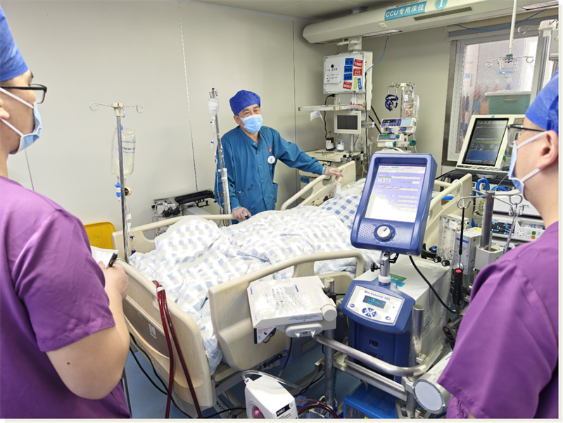 胡炳全副主任医师及陈春玲主治医师在为患者调整ECMO管路