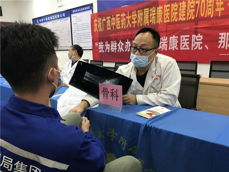 义诊活动现场,中医专家为中铁十四局的员工进行了诊治,对前来问诊员工提出的问题逐一做出了解答。骨科陈宜副主任医师在义诊过程中发现,由于工程人员或办公人员长期负重工作、长时间保持同一姿势等因素,造成一些常见疾病如脊柱侧弯、腰肌劳损等,针对这些问题,专家指出可以通过不定时改变工作体位、工作时适当减轻负重以及一些日常的放松肌肉等方式来预防职业病。此外,心血管内科何金龙副主任医师还对中铁十四局职工带来的体检资料进行了分析,指出血压偏高的人群应当清淡饮食,养成低盐少油的良好烹饪饮食习惯。普外科牙韩威副主任医师还发现,由于长时间站立作业,许多职工存在患上下肢静脉曲张的风险,并针对这一问题向大家提出了预防措施及日常保健知识。泌尿外科卢尚光副主任医师对职工常见的尿结石、前列腺炎等疾病提出了预防和保健措施。