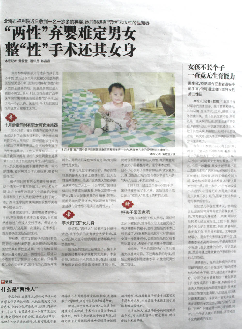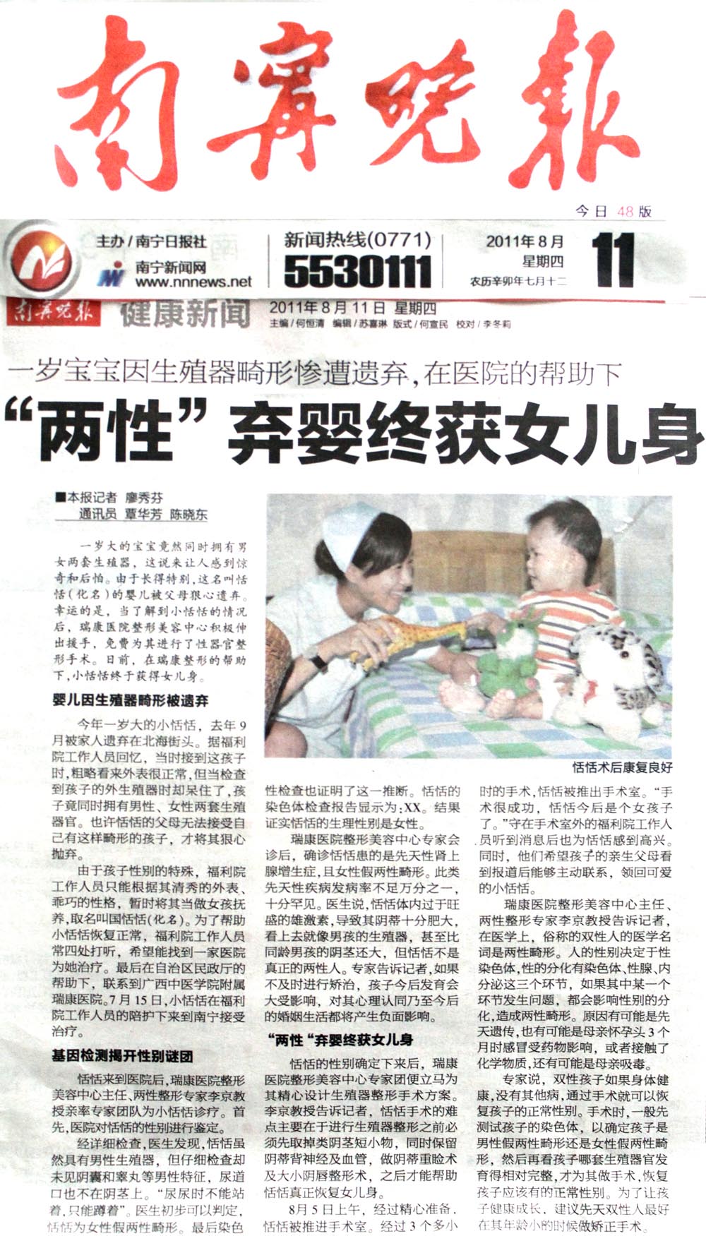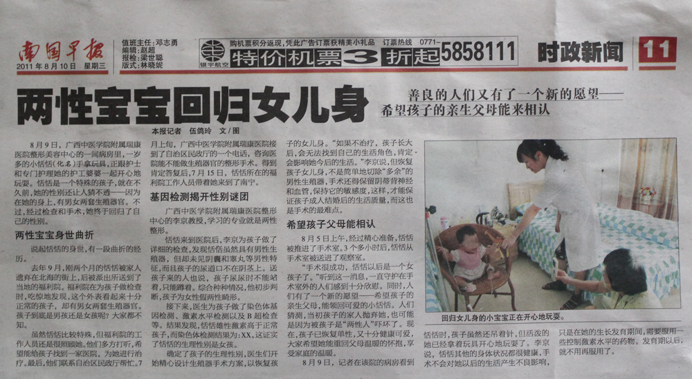 我院报道了《“两性”弃婴接受整“性”手术终获女儿身——瑞康整形为公益再行动》后,广西电视台、新华社广西分社、南宁电视台、南国早报、生活报、南宁晚报、南国健报、时空网、广西新闻网、新华网、江西卫视、新疆卫视等媒体竞相报道,引起广泛关注,同时,“能帮就帮”的南宁市民也打来电话或者专程到医院看望小恬恬,有部分好心市民希望领养恬恬。