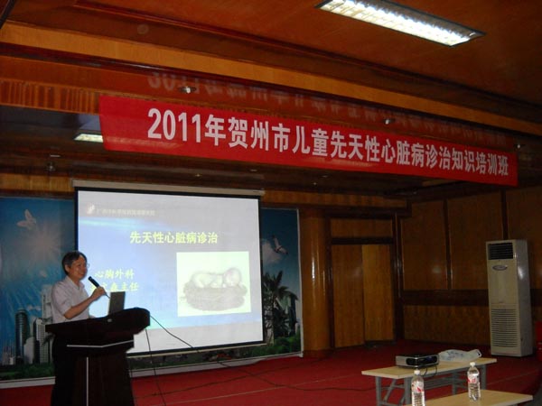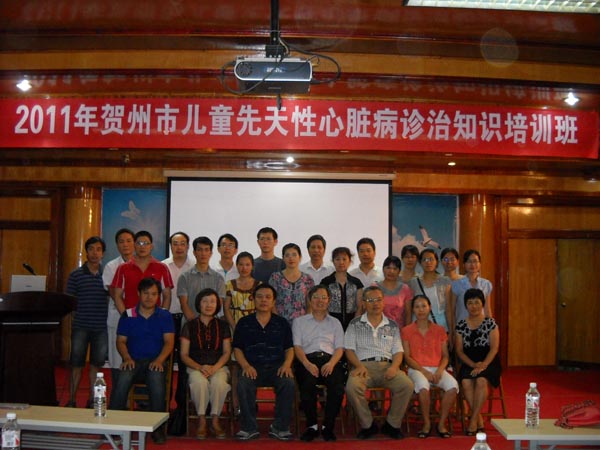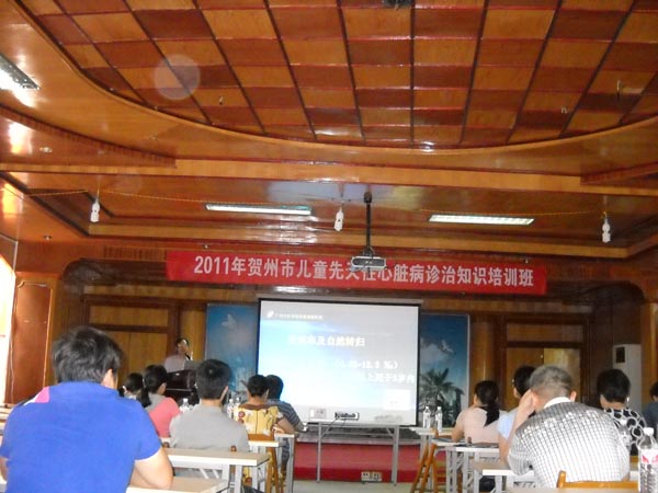 专家门店到达贺州后,首先在贺州市人民医院多媒体教室进行关于儿童先天性心脏病诊治知识的讲学,学员都是来自贺州市人民医院、贺州市广济医院、钟山县人民医院、富川县人民医院、昭平县人民医院心胸外科、心血管内科、超声科的骨