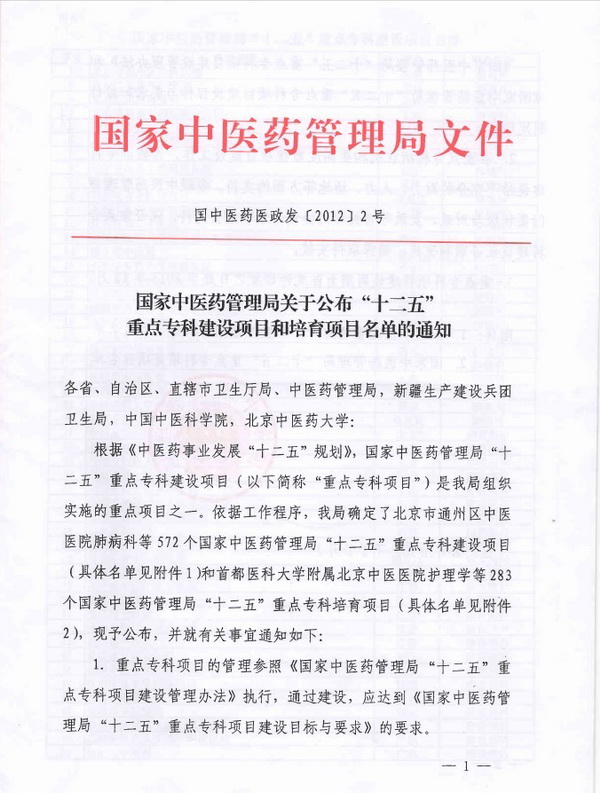 国家中医药管理局“十二五”重点专科培育项目