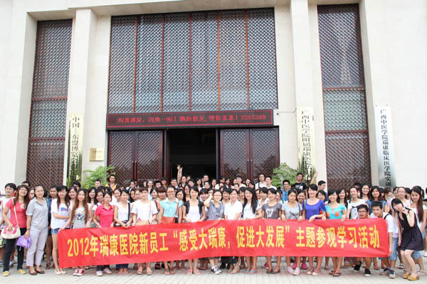 2012年7月28日,我院组织2012新员工进行“感受大瑞康、促进大发展”主题参观活动,到广西中医药大学新校区、弘中健康会所、中药民族药研发基地、空港院区及共建单位预备役高炮团等地进行参观。医院党委副书记陈日兰参加参观活动并讲话,人事科、团委、医务科、护理部、后勤科等部门领导、一附院团委书记林强及新员工160多人参加了活动。