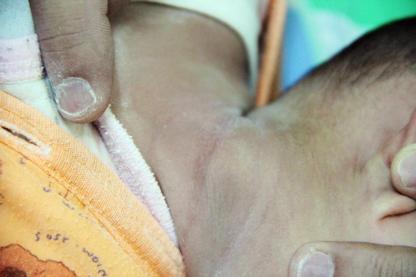 原来,可怜的邱毛毛不幸患上了小儿先天性肌性斜颈。刚出生一个多月的时候,细心的邱妈妈偶然发现喂奶的时候邱毛毛的头总是歪向一边,面部一边大一边小,而且他的脖子上有几个硬结,摸起来质地较硬,可以移动,不红不肿,表面皮肤正常,边界清楚。因为担心孩子患上了什么大病,邱妈妈赶紧带他来到了医院,经过医生的仔细问诊和B超检查,发现邱毛毛得的是小儿先天性肌性斜颈,脖子上不仅有该病典型的胸锁乳突肌条索状挛缩带,还有胸锁乳突痉挛绞索导致局部组织结缔化、纤维化形成的椭圆形肿块,肿块大小直径约3~4cm,几乎占了三分之一的脖子长。考虑到孩子年龄小,最适合的治疗手段便是推拿手法治疗了。