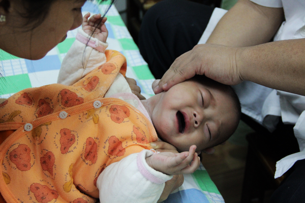 七个月大的邱毛毛躺在病床上哭闹得厉害,打门外经过就能听到他的哭声,邱妈妈只能心疼地按住他不断挥舞的手脚,才能让一旁的唐医生给他认真做颈部推拿手法按摩。