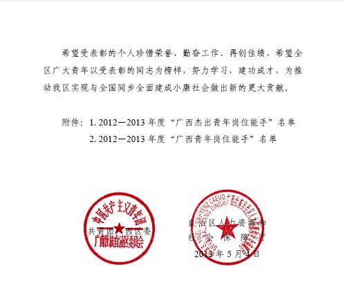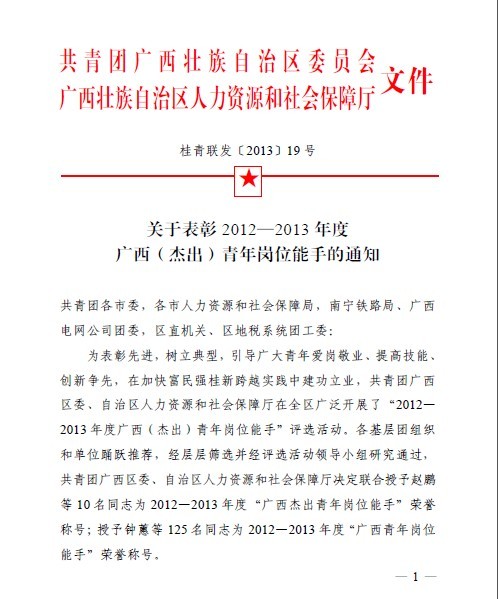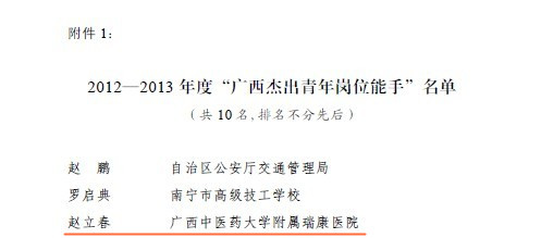 近日,共青团广西区委、自治区人力资源和社会保障厅公布了2012-2013年度广西(杰出)青年岗位能手名单。经过层层评选,我院赵立春荣获2012-2013年度广西(杰出)青年岗位能手荣誉称号(全区10名),叶修廷荣获2012-2013年度广西青年岗位能手荣誉称号(全区125名)。