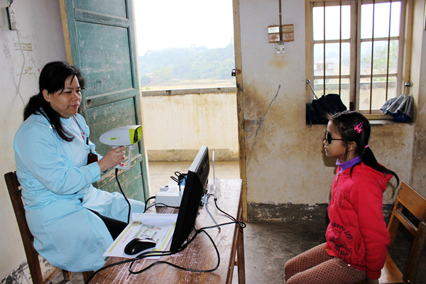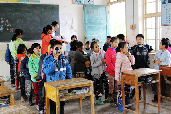 与此同时,在江林村小学的教室里,给孩子们检查视力的活动也在如火如荼地进行着。视光中心的三位医务人员与红十字会的一位同仁,分工明确,有条不紊。他们先用视力表对学生进行初筛,初筛有问题的则进一步用电脑验光仪筛查屈光度、弱视散光等问题,登记整理后把数据提供给校方,并叮嘱学生好好保护眼睛,注意视力。