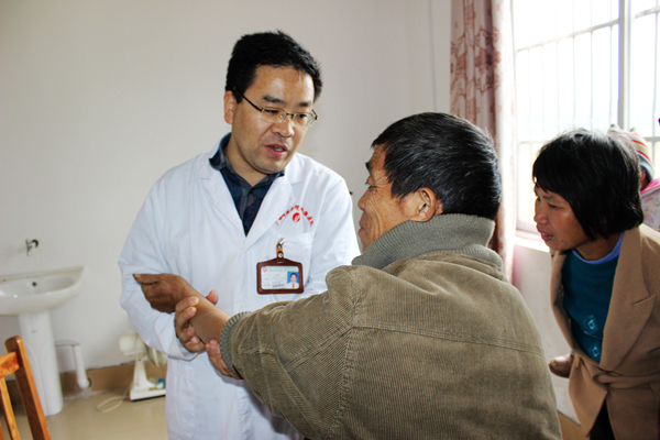 而此时在卫生所小小的诊断室里,骨四肢科的陈涛医生正为一群老村民们依次检查骨关节等问题。兴许是从未见过这样的诊断方式,当陈涛医生让一位阿婆俯卧在病床上检查腰椎时,一旁观看的村民都忍不住咯咯笑起来。陈医生趁着这轻松的气氛,顺便就给在场的村民们普及起骨科知识来,他叮嘱他们有了腰椎问题不要过分劳累,平时可以通过一些保健操的动作来缓解腰椎疲劳。