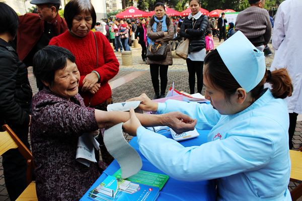 我院健康管理中心医务人员在为小区居民免费测量血压