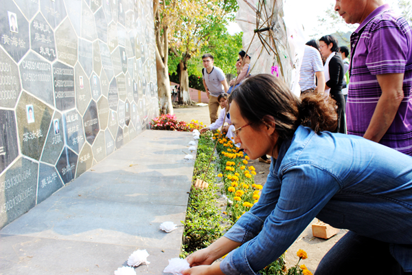 在纪念墙前献上小白花