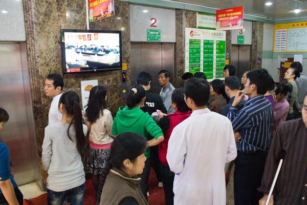 病友们在观看蓝云同志先进事迹报告会电视直播