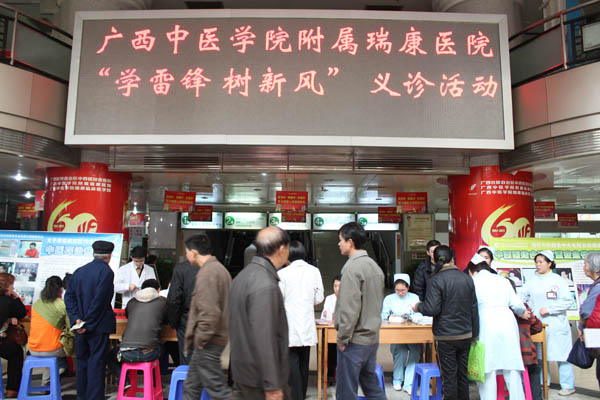 我院党委副书记陈日兰在接受广西电视台记者采访时说,自今年以来,我院已经举办过很多次义诊活动,医院的为民志愿服务志愿者队伍已经成立几年了,这几年一直在默默地为群众服务,得到了群众的一致好评。陈日兰副书记表示,不仅仅是在3月的学雷锋月,瑞康医院的职工们会一直把雷锋精神铭记心中,像雷锋同志一样,全心全意为人民服务,为老百姓做力所能及和有意义的事情。