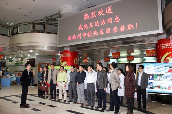 2012年3月30日,医院在一楼大厅举行兰达治同志到钦州市钦北区挂职欢送仪式,院长助理韦思尊、党政办公室、人事科、医务科、财务科、教务学生科、团委等部门的负责人及20多名青年团员参加了欢迎仪式,学院团委副书记王春花亲自送兰达治同志到挂职单位报到上岗。兰达治同志是我院团委委员、五针皮团支部书记、口腔科医生,挂职岗位是钦州市钦北区团委副书记。