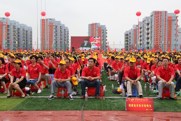 鲜花盛开,彩旗飘扬,鼓乐齐鸣,礼花绽放。2012年5月25日上午,广西中医药大学揭牌庆典大会在仙葫新校区运动场隆重举行,国家和自治区有关部门的领导、兄弟院校的代表、近万名师生、校友、来宾欢聚一堂,共同庆祝广西中医学院更名为广西中医药大学。我院组织了500人的方队参加庆典,方队成员统一着装,精神抖擞,显示出团队的精神面貌以及作为广西中医药大学其中一员的骄傲与自豪。