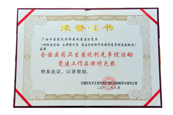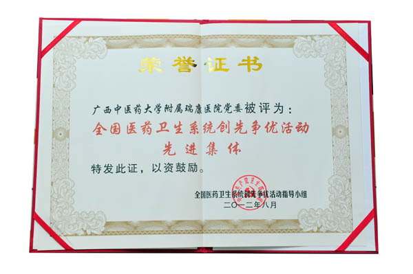 自2010年中央及自治区党委开展创先争优活动动员部署后,瑞康医院党委在上级党委的指导下,紧密结合行业实际,突出岗位特点,扎实推进创先争优活动上水平、创特色、出成效。形成了支部履职尽责创先进、党员立足本职争优秀的生动局面,医院被确立为国家中医药管理局全国中医药系统创先争优典型和示范点;广西创先争优活动领导小组办公室先进基层党组织示范点;广西卫生系统创先争优典型和示范点;全国“五好党组织”基层党组织风采大赛中荣获第十五名;医院创先争优活动得到了卫生部副部长王国强、陈啸宏、原自治区党委副书记、自治区创先争优活动领导小组组长陈际瓦等领导的高度评价,2011年5月医院党委参加了全国中医药系统创先争优视频会主会场会议并在会上做经验交流。
