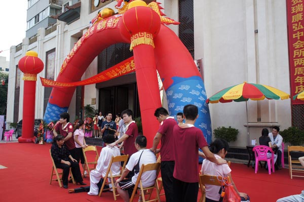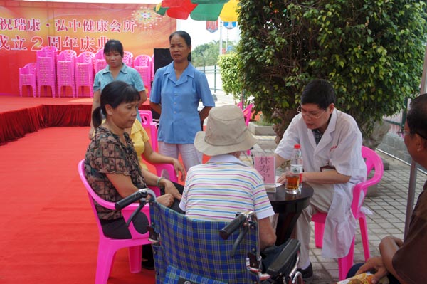 2012年9月22日上午9点,瑞康弘中健康会所成立两周年健康义诊活动在弘中会所前广场举行。全国名老中医韦贵康教授,“邕城好医生”林寿宁教授,骨科陈锋博士,主任医师、泌尿小儿外科科副主任医师梁霄,乳腺科副主任医师莫小勤,儿科主任医师李日东,妇科副主任医师郭伟堃,内分泌科副主任医师方兆东等瑞康名医为邕城市民奉上秋季养生治未病“盛宴”。在义诊活动现场,弘中健康会所的技师们免费为市民提供中医经络检测、AMP血液检测、膏方调理、腰腿痛、肩颈疾病推拿理疗等服务。
