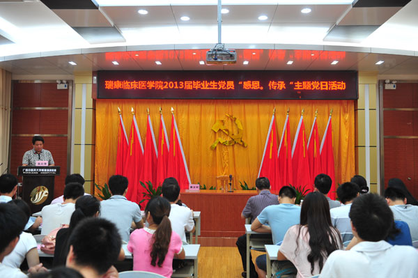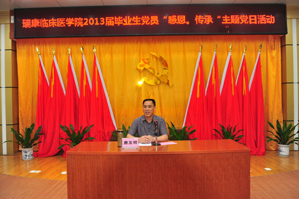 教务学生部主任莫启章主持第二个议程——主题党日活动。唐友明书记发表了热情洋溢的讲话,他在讲话中表示,首先祝贺党员同志们即将顺利毕业离校,即将踏上新的希望征程,即将开启人生崭新的篇章,感谢党员同志们长期以来为学校和学院的发展所做出的无私奉献和辛勤付出。唐书记指出,多年来,广西中医药大学已经形成了两个传统:第一,每年9月全体新生党的基本知识教育活动;第二,每年6月全体毕业生党员的主题教育活动。这两个活动的举办,不仅有利于瑞康临床医学院各级党组织凝聚力、战斗力、向心力的提高,也有利于学生党员的全面发展,更有利于优良班风、学风、精神的传承。同时,唐书记在讲话中谈到,2013届毕业生党员,是广西中医药大学和瑞康临床医学院快速发展、发生翻天覆地巨变的见证者和参与者,也是学校2013届全体毕业生当中的佼佼者和先锋模范。在谈到当前社会存在的突出问题时,唐书记希望全体党员同志始终能够“旗帜鲜明、立场坚定、态度坚决”,面对不良现象时始终能够“讲得清楚,道得明白,说得圆满”。此外,他在发言中也勉励全体党员:“一名党员,就是一面旗帜”、“祖国强盛,我的责任”、“就业岗位和国家需要的匹配,决定着人生价值能够达到的高度”、“学好中医瑰宝,争做精诚大医”。