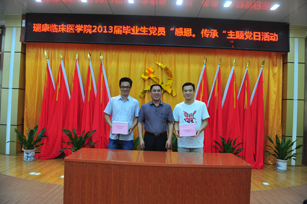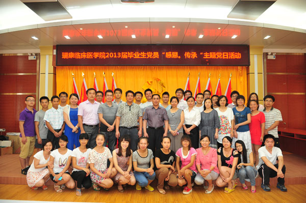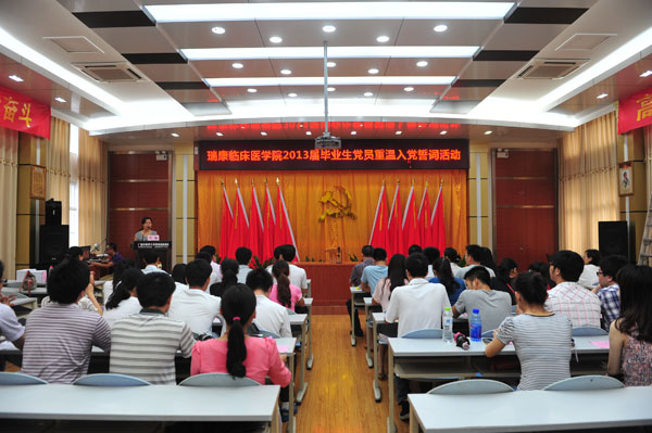 春华秋实,四季更替。宜将青春奏凯歌,共创伟业正当时。在中国共产党92岁生日即将到来之际,在全体毕业生党员即将离校之际,瑞康临床医学院拉开了庆祝建党92周年系列活动的序幕。6月25日下午,瑞康临床医学院在瑞康医院十楼第七教室成功召开2013届毕业生党员重温入党誓词暨毕业生党员“感恩.传承”主题党日活动。党委书记唐友明、教务学生党总支书记王瑜、教务学生部主任莫启章、团委书记叶修廷、教务学生党总支副书记秦明芳、教务学生部副主任汪国翔、教务学生党总支全体委员及2013届毕业生党员参加活动。