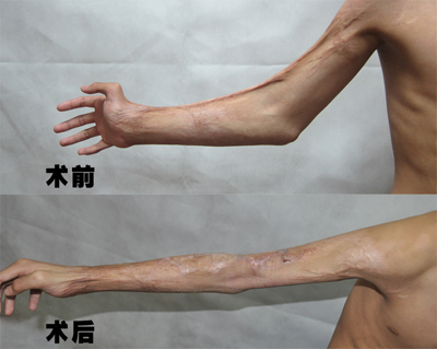 黄新教授对小松右上肢状况进行精心评估和局部皮瓣设计后,进行了疤痕松解及游离植皮术。经过4个多小时手术,小松顺利被推出手术室,手术取得圆满成功。