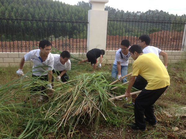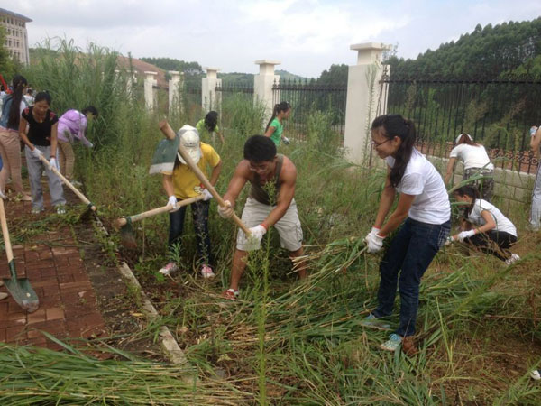 我院2012级临床专业25名学生在老师们的带领下,与各二级学院学生携手合作,完成了校园道路旁的杂草清除工作。当天上午,同学们与老师一道,顶着烈日,手拿锄头、铲子、镰刀在杂草丛生的道路旁干得热火朝天,两小时内就将校道旁的荆棘、野草、废弃建筑垃圾清理干净。