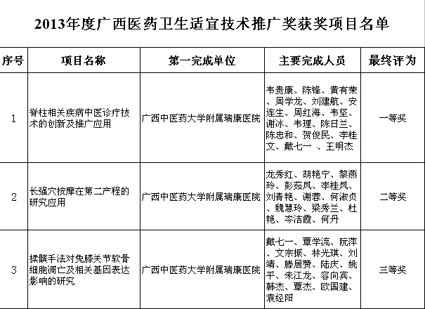 2013年度广西卫生适宜技术奖评审工作已经结束,根据2013年9月12日广西卫生科教管理学会发布的《关于公布2013年度广西医药卫生适宜技术推广奖项目的通知》(桂卫科教会〔2013〕5号),我院今年喜获3项广西医药卫生适宜技术推广奖,具体见附表。
