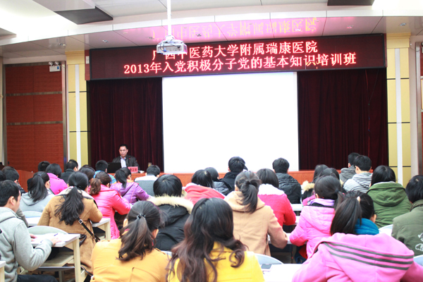 12月19日至20日,广西中医药大学瑞康临床医学院2013年入党积极分子培训班开课。医院党委书记唐友明,党委副书记、纪委书记陈日兰及教务学生党总支书记王瑜为入党积极分子教授党的基本知识相关课程。