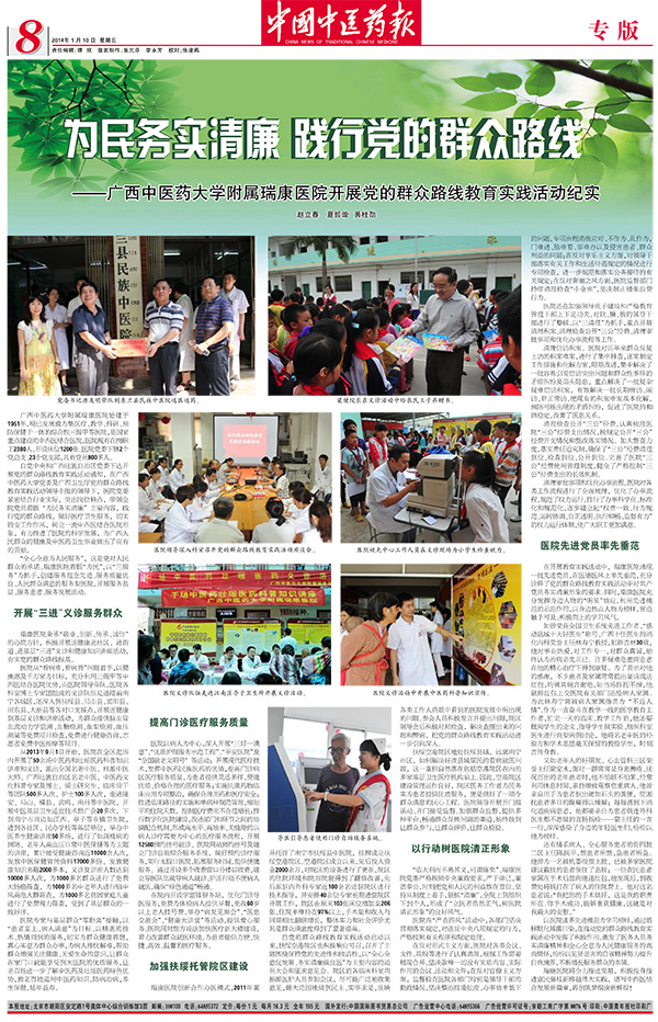《中国中医药报》是国家中医药管理局主管的中医药行业唯一的权威性大报,其发行覆盖全国20000家医疗机构,近1000家卫生教育、科研机构,数千家医药企业、医疗器械企业、保健品企业,20000家药店和近10万大众订户,不仅是医疗行业的大型专业媒体也是大众喜闻乐见的健康读物。该报于2014年1月10日在第八版对我院开展党的群众路线教育实践活动情况进行了专题报道——《为民务实清廉 践行党的群众路线——广西中医药大学附属瑞康医院开展党的群众路线教育实践活动纪实》。