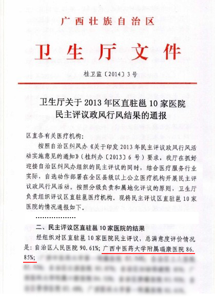 近日,由自治区卫生厅组织的2013年全区公立医疗机构民主评议政风行风活动结果出炉,我院总体满意度在区直驻邕较大的10家公立医院中位列第二。