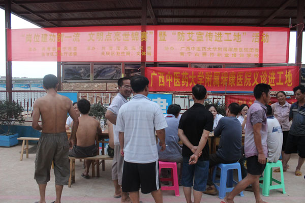 2014年6月27日下午,我院团委积极响应医院党委“七一”系列活动之“走基层、服务群众”的活动号召,组织青年职工赴广西体育中心世界体操锦标赛场馆建筑工地参加共青团南宁市委、自治区卫生厅团委、中共良庆区委及良庆区人民政府共同组办的“树行业新风、喜迎世锦赛”暨“防艾宣传进工地”活动。