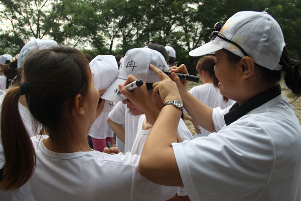 学员们给彼此的帽子写上名字