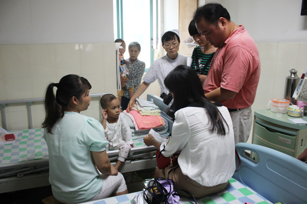 小青宏出院时,+31号病床的哲民正依偎在妈妈怀里,已经两岁的他,因为先天性心脏病的原因到现在还不会走路,因为病情复杂,之前在其他医院住院时,被医生告知无法完成这样高难度的手术,建议哲民的爸爸妈妈带孩子去上海做手术,但如果去上海,不仅花费对他们来说如同天文数字的手术费用,而且由于跨省的原因还不能享受新农合报销等政策,无奈之下他们只好求助南宁电视台《帮得行动》,在镜头前,哲民的妈妈流着泪,紧紧地抱着孩子说,无论如何也不会放弃。这一幕正巧让我院工作人员看到,于是通过记者联系上了哲民的妈妈,告知她瑞康医院有“2014年世界心脏日—救治先天性心脏病患儿”活动,并且孩子所患的法洛四联症在瑞康医院已成功做了几百例。得知这一消息,哲民的妈妈赶紧带着孩子过来住院,目前,哲民正在做一系列的检查,等检查结果出来,专家再进一步根据孩子的情况做手术计划。