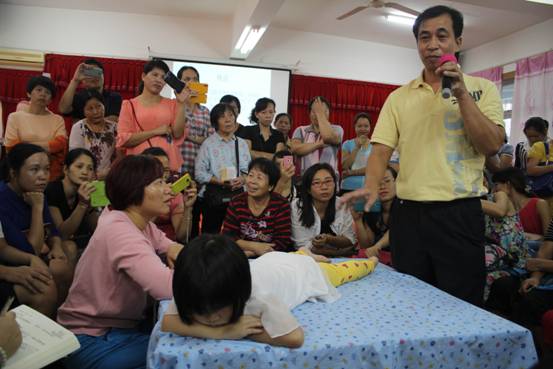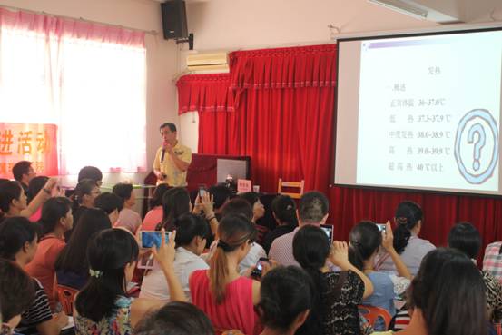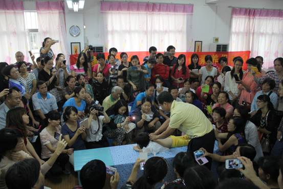 李日东副主任围绕小儿发热伴随的常见病,发热的判断和确诊,以及家庭物理降温等紧急处理办法和注意事项展开并进行一一详述,同时李主任还现场开展小儿捏脊手法培训,师生和家长们把培训现场团团围住,积极学习,活动现场热闹非凡。