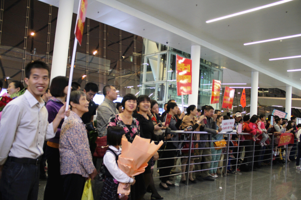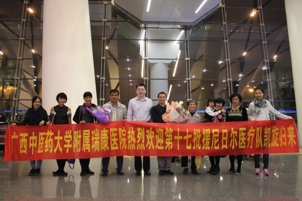 11月3日晚, 第17批援尼日尔医疗队抵达南宁吴圩国际机场T2航站楼,圆满完成援尼日尔医疗服务任务载誉而归。由我院副院长高宏君、人力资源部副主任张巧玲、工会常务副主席郑莹、人力资源部工作人员及我院两位医生的家属组成的接机队伍在机场热情迎接凯旋的专家。