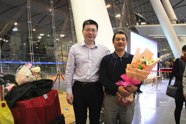 接机队伍怀着无比激动的心情早早地等待在出站口,并紧紧地盯着出站大屏幕,时间一分一秒地过去,18:59接机队伍忽然沸腾起来,面带微笑的援外医疗队员陆续从乘客出口通道走出,我们也终于盼来了久别两年的王宗善与姚彦文两位专家。欢呼声伴随着掌声,鲜花与微笑,热情地握手和紧紧地拥抱,在场的所有人都被久别重逢的喜悦感染了。